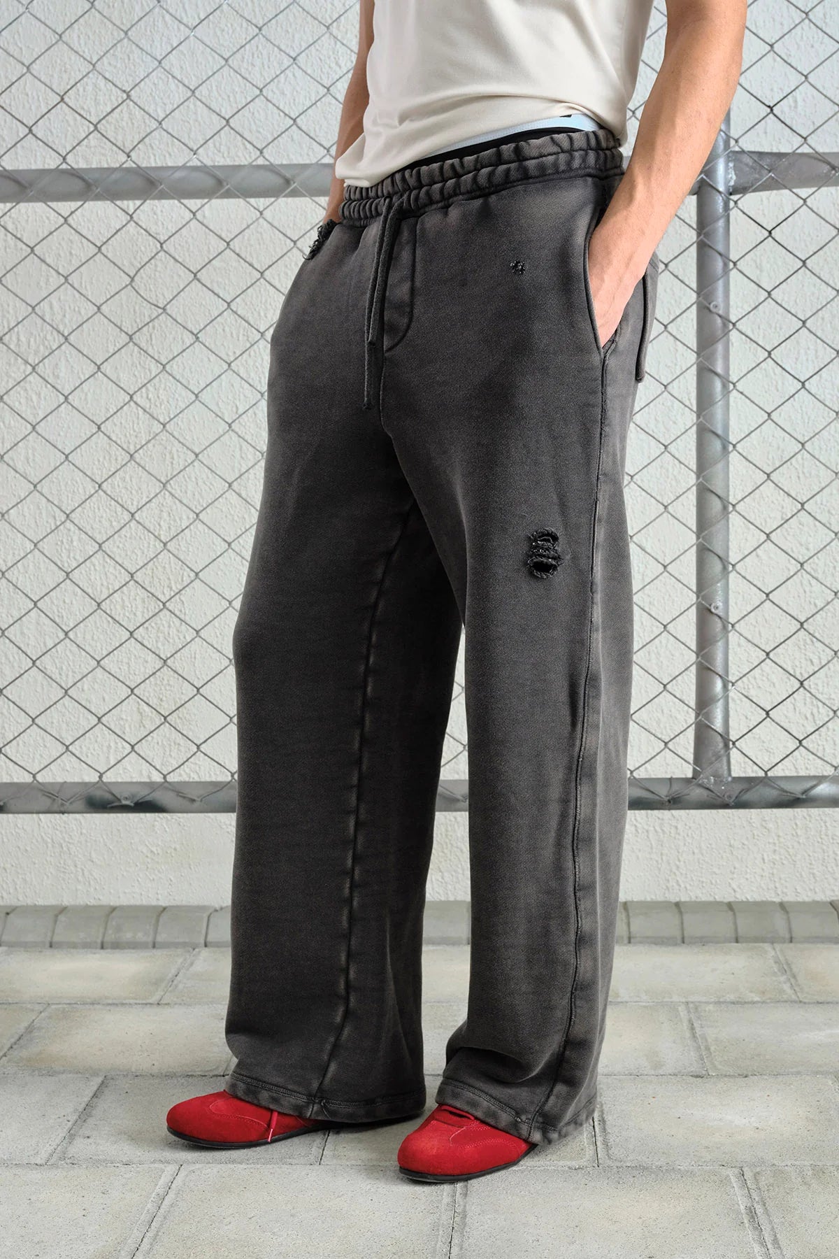 Baggy-fit jogger pants with a washed finish, distressed details, and an elastic waistband. Featuring a wide-leg silhouette, these grey pants offer a modern look with a bold style beyond comfort. Distressed details add a unique touch, creating an eye-catching appearance. The elastic waistband provides comfort, while the relaxed baggy fit adds a confident edge to outfits. A strong choice for casual wear lovers.